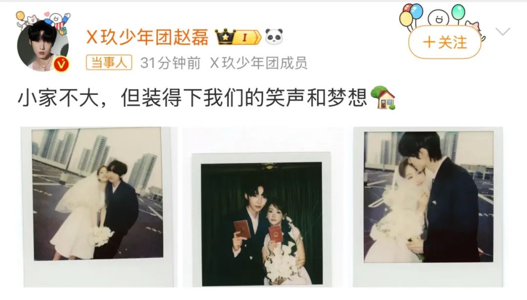 2月14日情人节,男歌手、X玖少年团成员赵磊在微博晒出和妻子手拿结婚证的合照,官宣结婚喜讯。他写道:“小家不大,但装得下我们的笑声和梦想”。