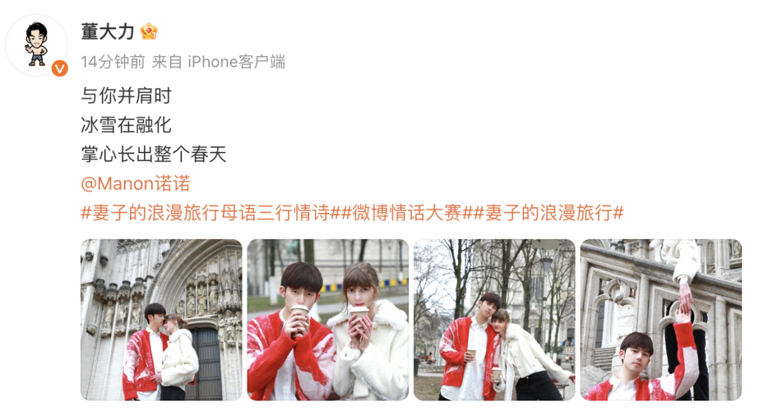 13点14分,前击剑运动员董力和@Manon诺诺 晒合照官宣参加节目《妻子的浪漫旅行》,间接官宣结婚喜讯。