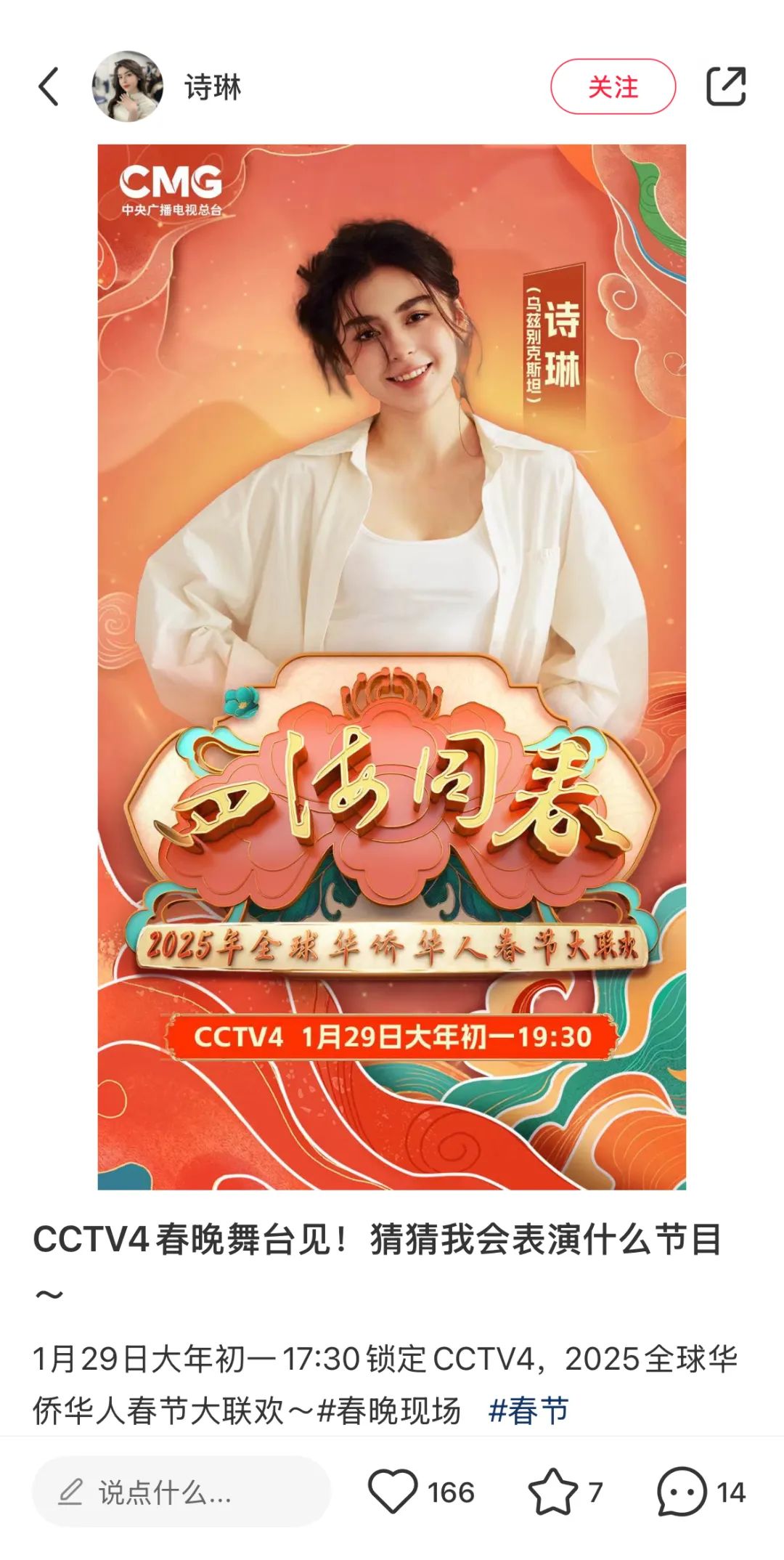 据悉,就在上个月底,诗琳还参加了2025年全球华侨华人春晚,登上了央视舞台。