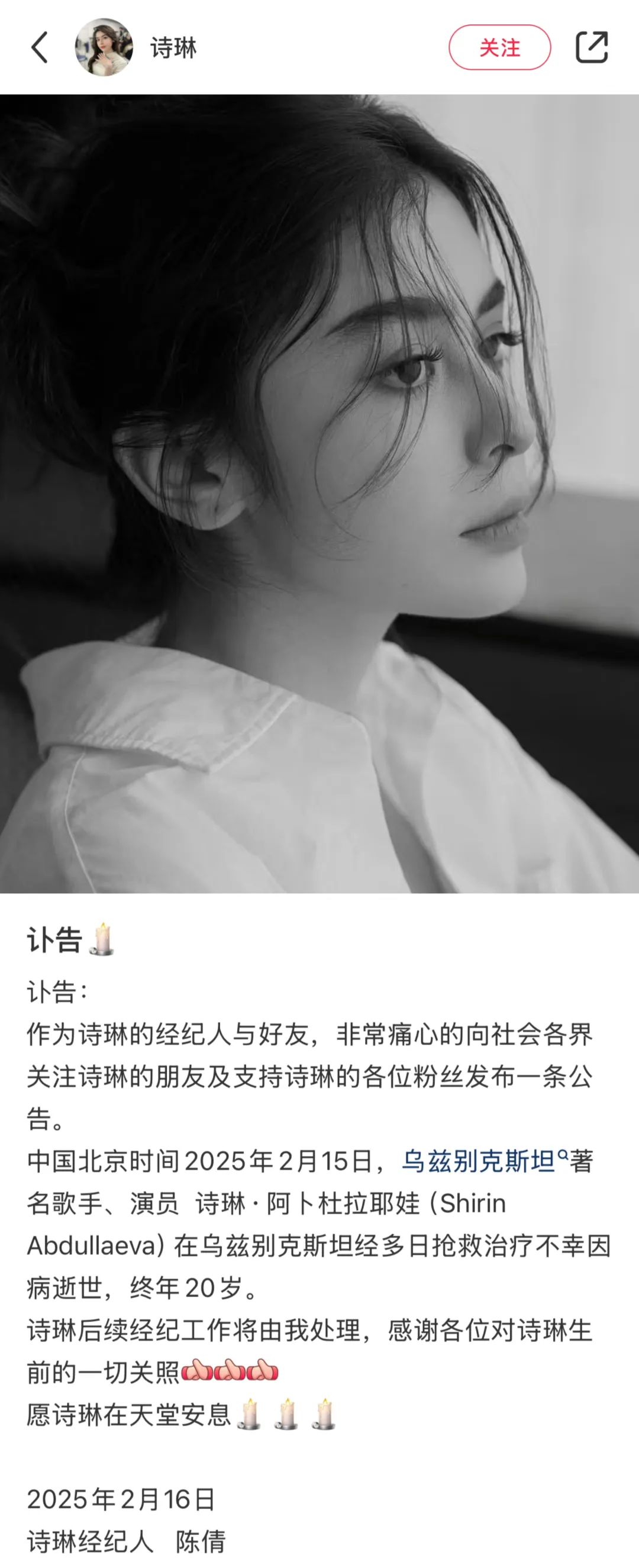2月16日消息,有“中亚天籁”美誉的歌手诗琳去世,年仅20岁。