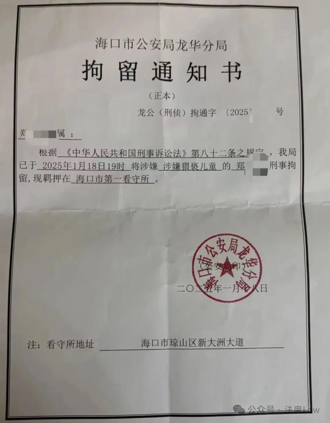 《拘留通知书》由海口市公安局龙华分局于今年1月18日签发,郑某峰因涉嫌猥亵儿童于当日19时被刑事拘留,其被羁押在海口市第一看守所。