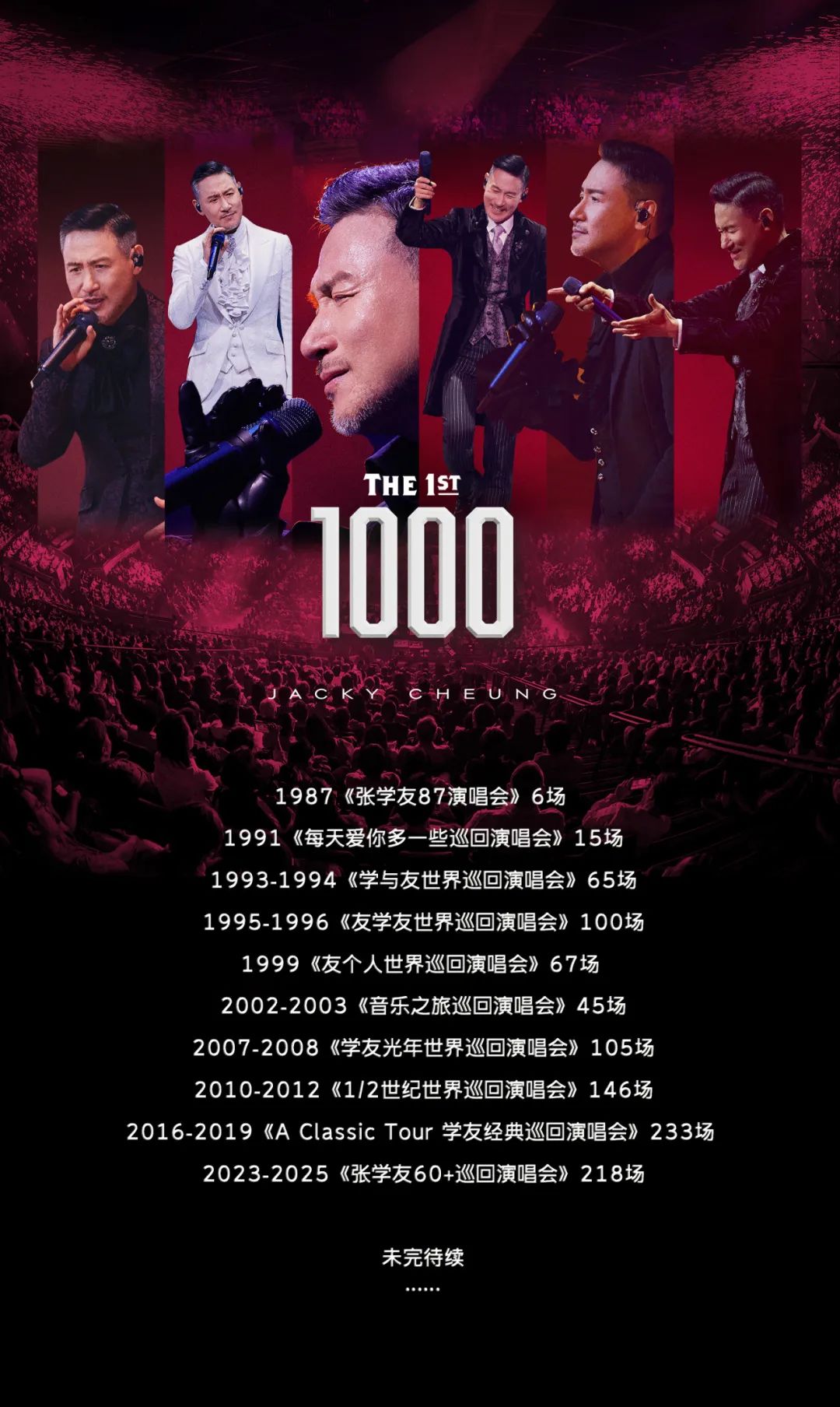 自1987年首轮个人巡演《张学友87演唱会》从香港红磡出发,到2025年的第10轮巡演,累计场次达到1000场,整个历程跨越了38年,走访了超过18个国家和地区的百余座城市。