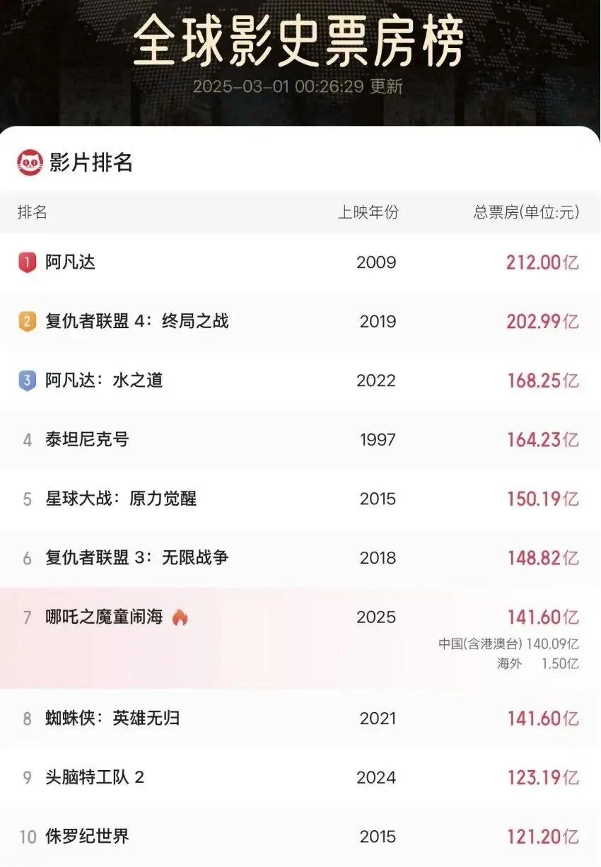 截至3月1日,影片《哪吒之魔童闹海》累计票房(含预售)超141.60亿元,超《蜘蛛侠:英雄无归》票房成绩,进入全球票房榜前7位!