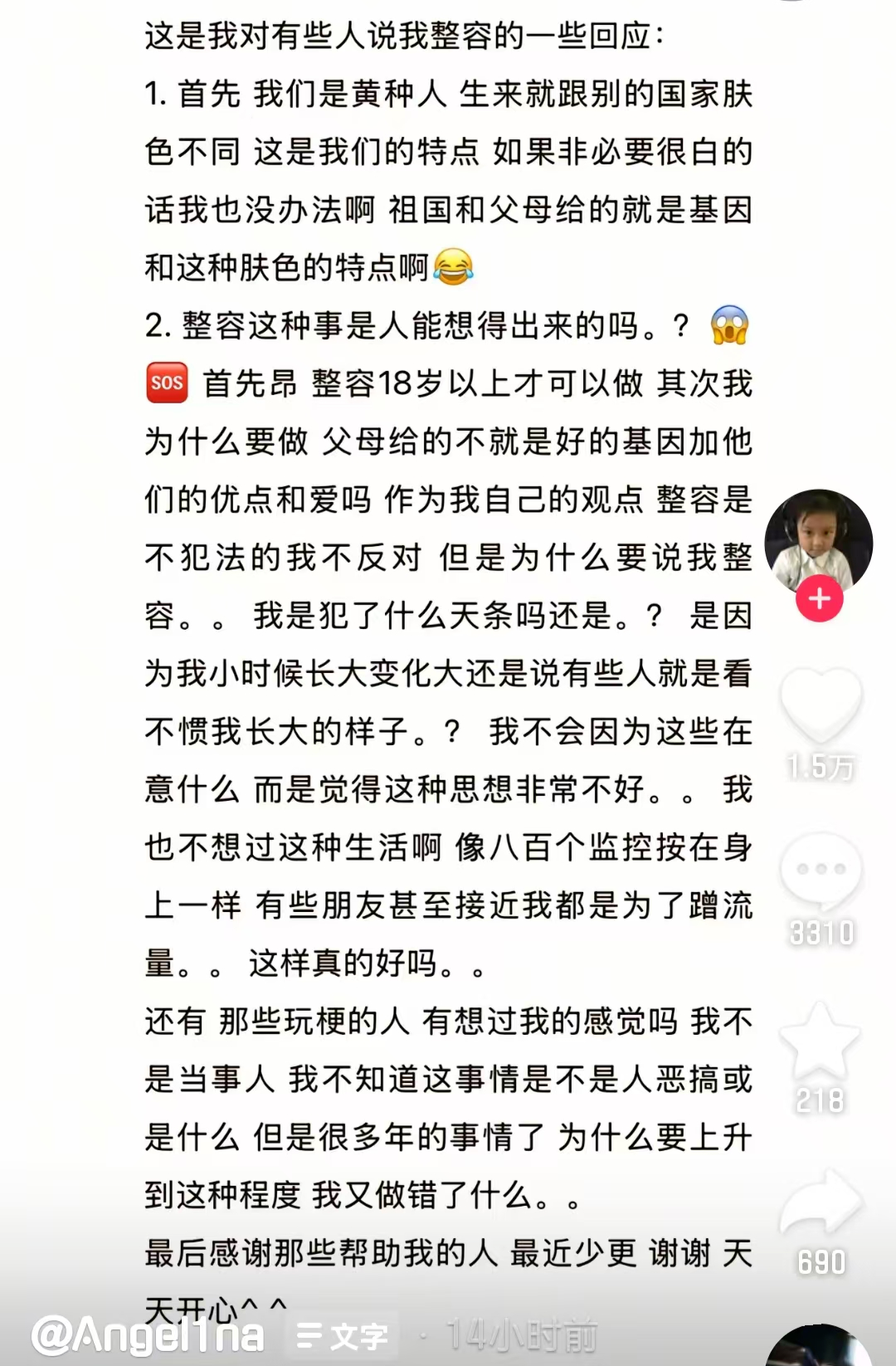3月2日,甜馨再发长文回应,否认整容,并且在评论区自曝被同学孤立。