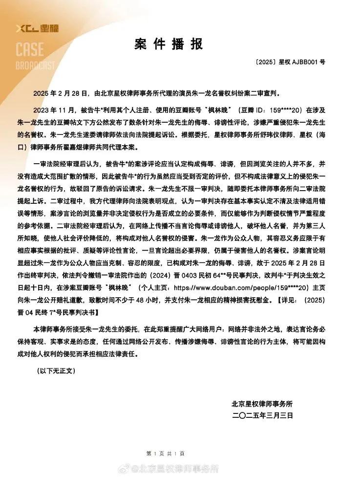 近日,演员朱一龙名誉权纠纷案二审宣判。