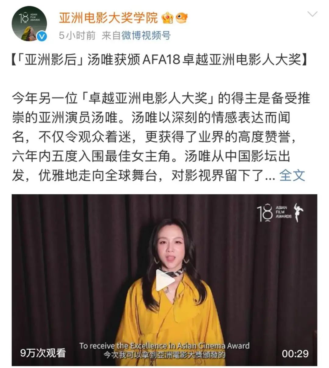 3月5日,据@亚洲电影大奖学院 消息,汤唯获亚洲电影大奖卓越亚洲电影人大奖,她曾在六年内五度入围最佳女主角。第18届亚洲电影大奖颁奖典礼将于3月16日在香港举办,汤唯将出席。