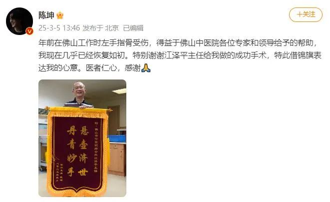 3月5日,陈坤在社交平台发文送锦旗感谢医生治愈其左手指骨。
