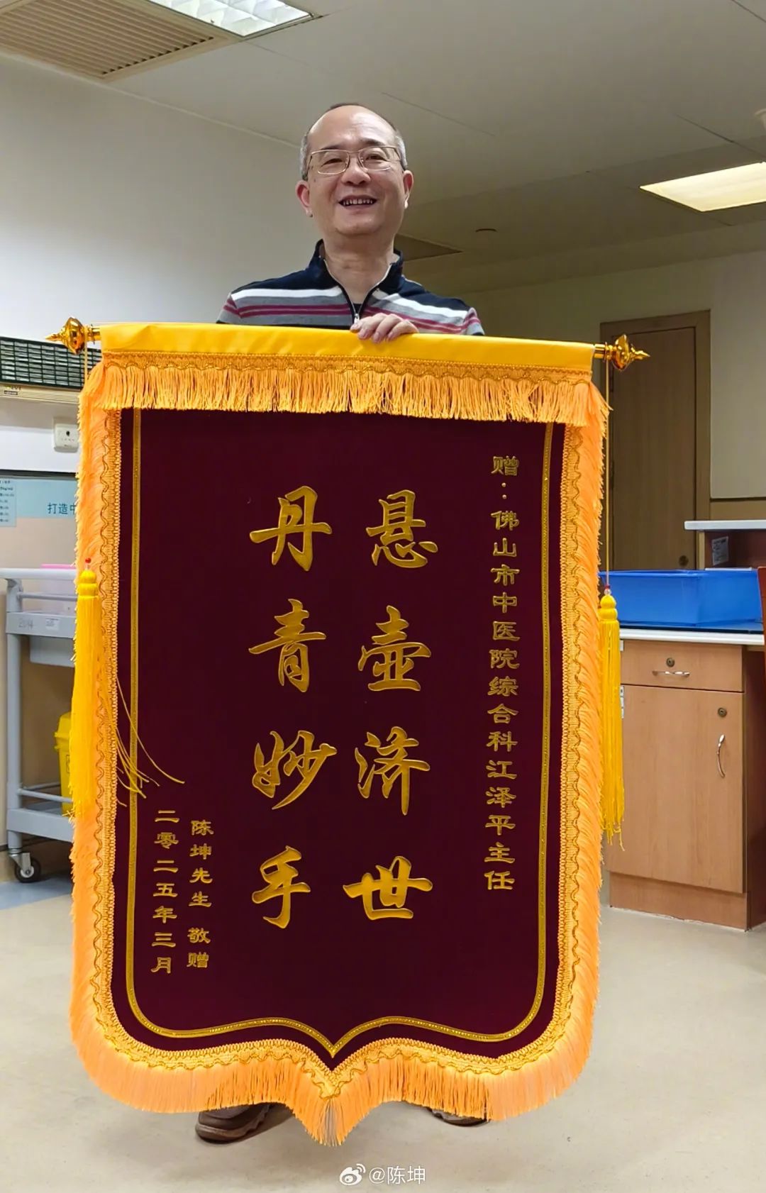 陈坤表示:“年前在佛山工作时左手指骨受伤,得益于佛山中医院各位专家和领导给予的帮助,我现在几乎已经恢复如初。特别谢谢江泽平主任给我做的成功手术,特此借锦旗表达我的心意。医者仁心,感谢。”