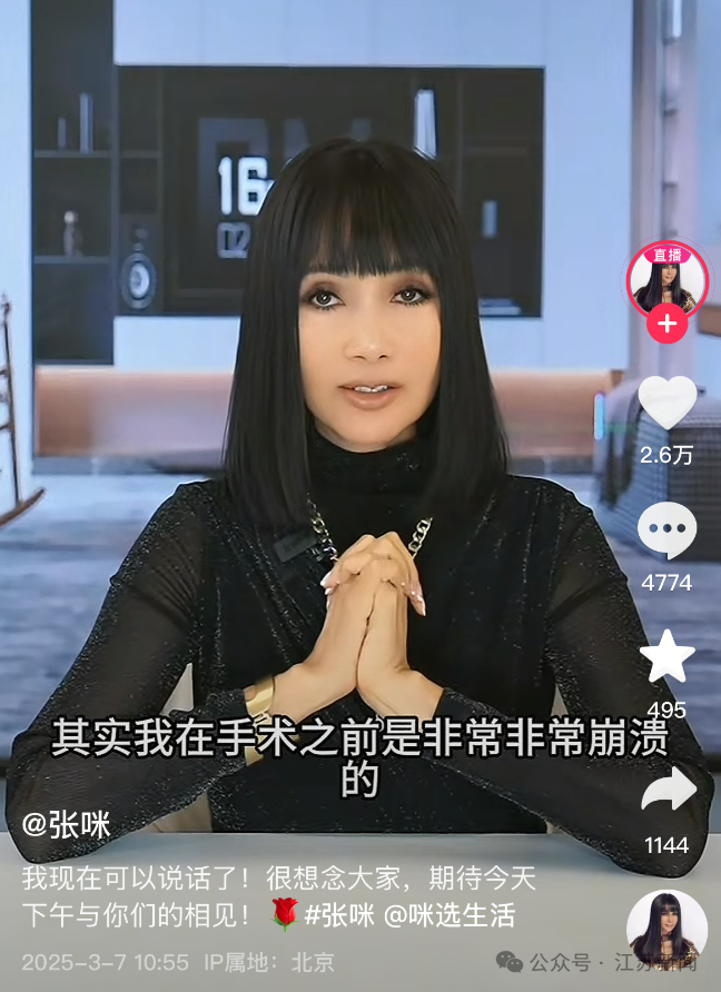 3月7日,知名歌手张咪在社交平台发视频,称其“现在可以说话了”。