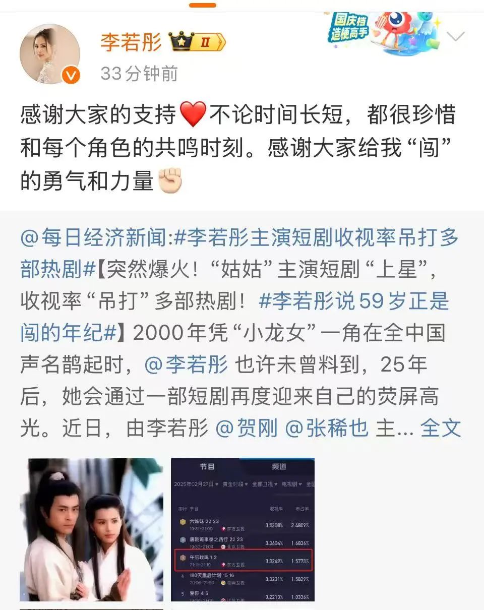 2000年凭“小龙女”一角在全中国声名鹊起时,李若彤也许未曾料到,25年后,她会通过一部短剧再度迎来自己的荧屏高光。