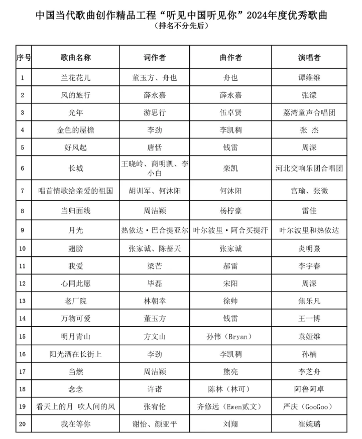 3月13日,据中国音乐家协会官微消息,中国当代歌曲创作精品工程“听见中国听见你” 2024年度评选结果公示。其中包括王一博的《万物可爱》,谭维维的《兰花花儿》,张杰的《金色的屋檐》,周深的《好风起》《心同此愿》,李宇春的《我爱》,袁娅维的《明月青山》,孙楠的《阳光洒在长街上》等。