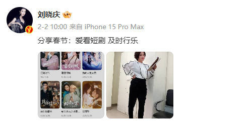 今年2月2日,刘晓庆就在微博晒照表示,自己爱看短剧,她还发了一张自己在看剧本的照片,疑似将进军短剧赛道。