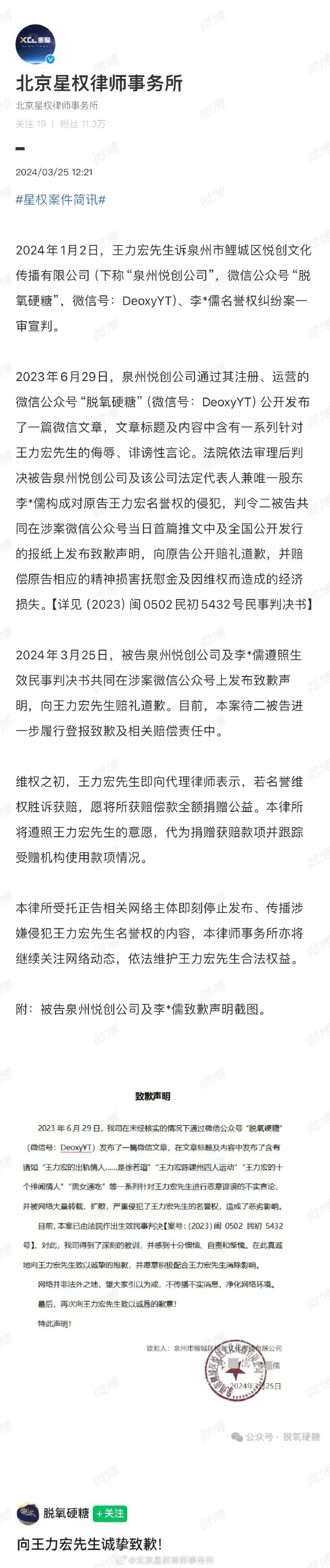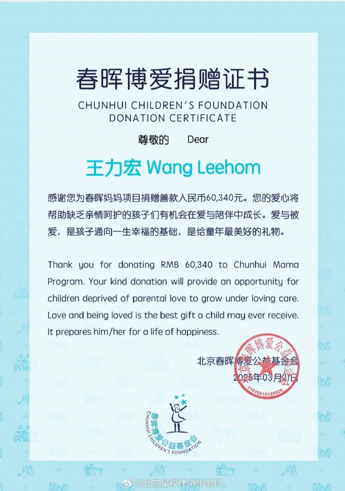 2025年3月21日,北京星权律师事务所遵照王力宏先生意愿,将(2023)闽0502民初5432号名誉维权案所获赔偿款共计60340元全额捐赠至春晖博爱公益基金会“春晖妈妈”项目。