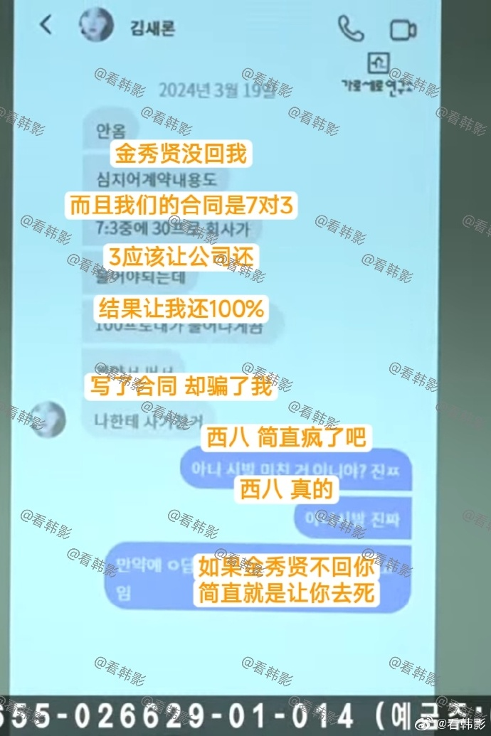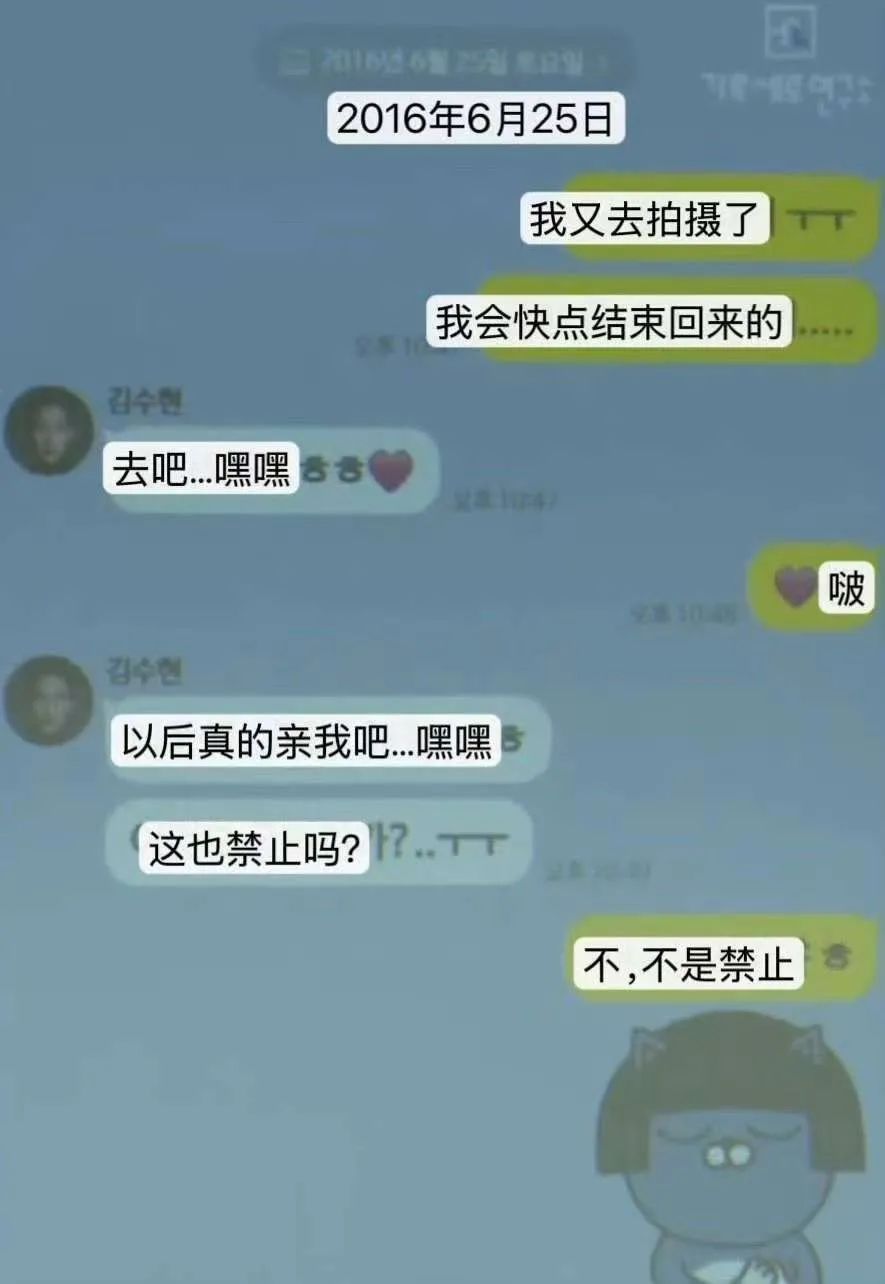 另外,聊天记录中还有金秀贤强烈求爱狂喊“我想你、要亲亲”的文字内容。据金赛纶跟朋友聊天记录截图,金赛纶称金秀贤用合同骗她,让她100%赔偿。