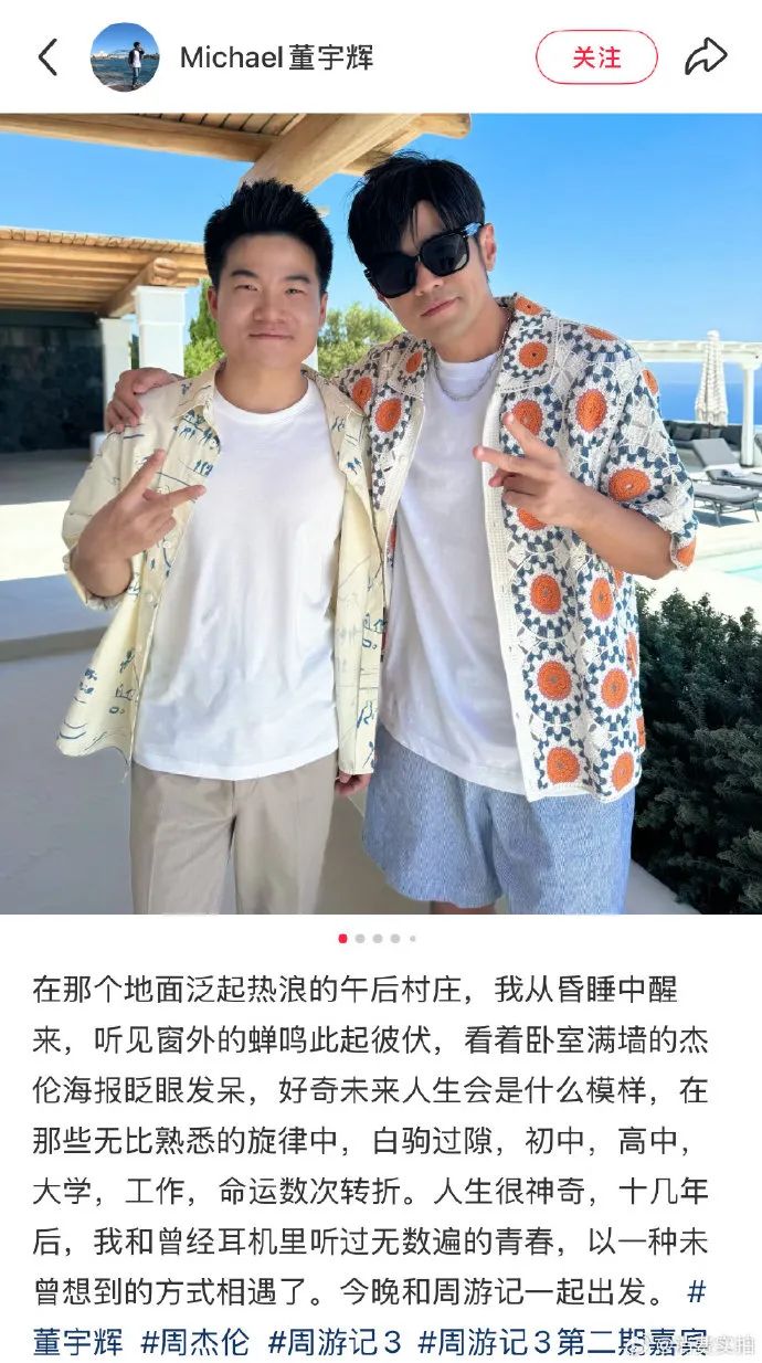4月5日,董宇辉在社交媒体上分享了一张与周杰伦的合照,并配文:
