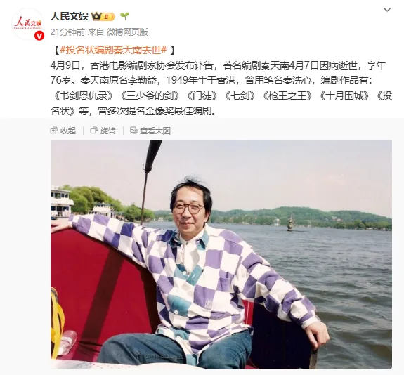 据@人民文娱 10日报道,4月9日,香港电影编剧家协会发布讣告,著名编剧秦天南4月7日因病逝世,享年76岁。