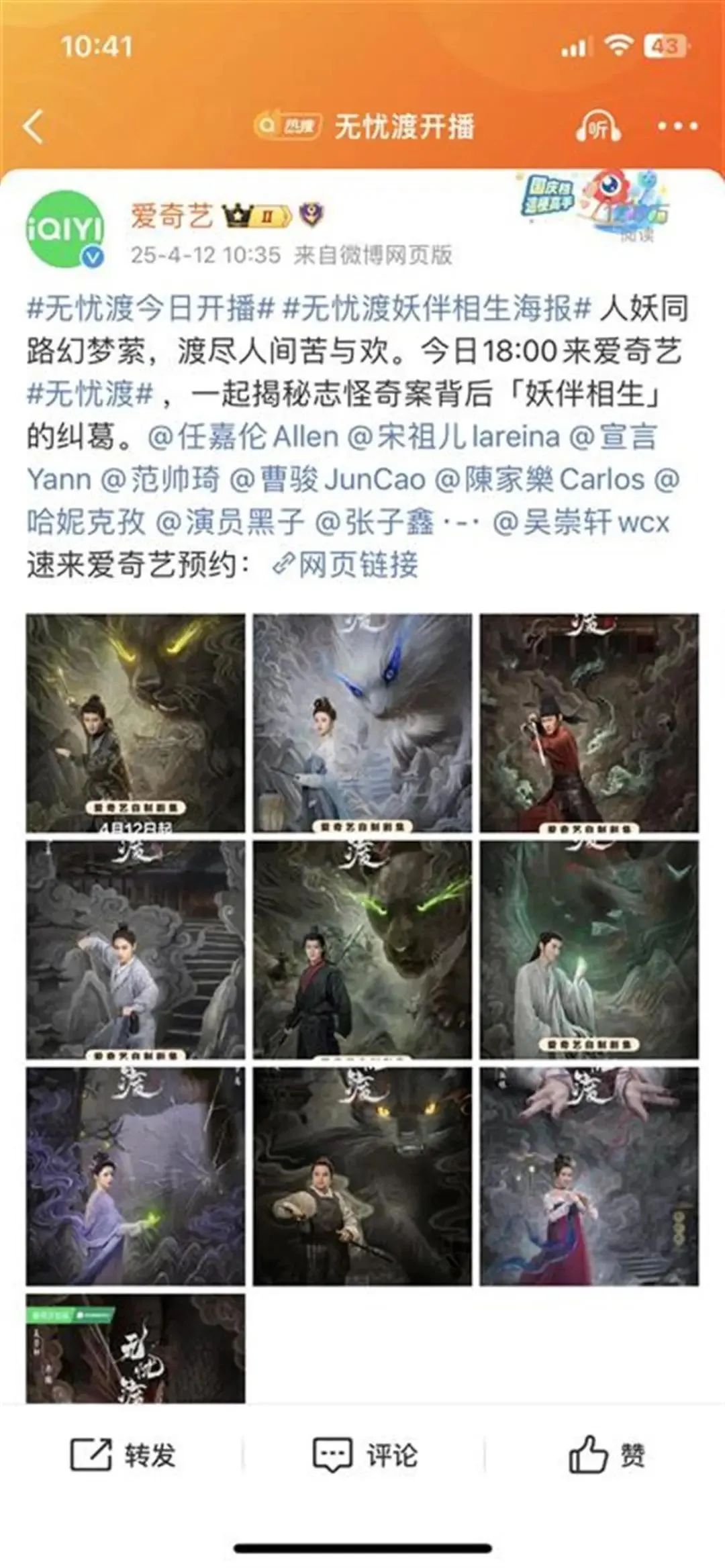 4月12日10:05,爱奇艺官方微博官宣《无忧渡》将在当晚6:00开播。
