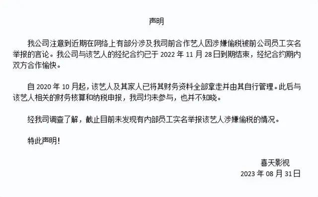 2023年8月31日,喜天影视发布声明,内容如下: