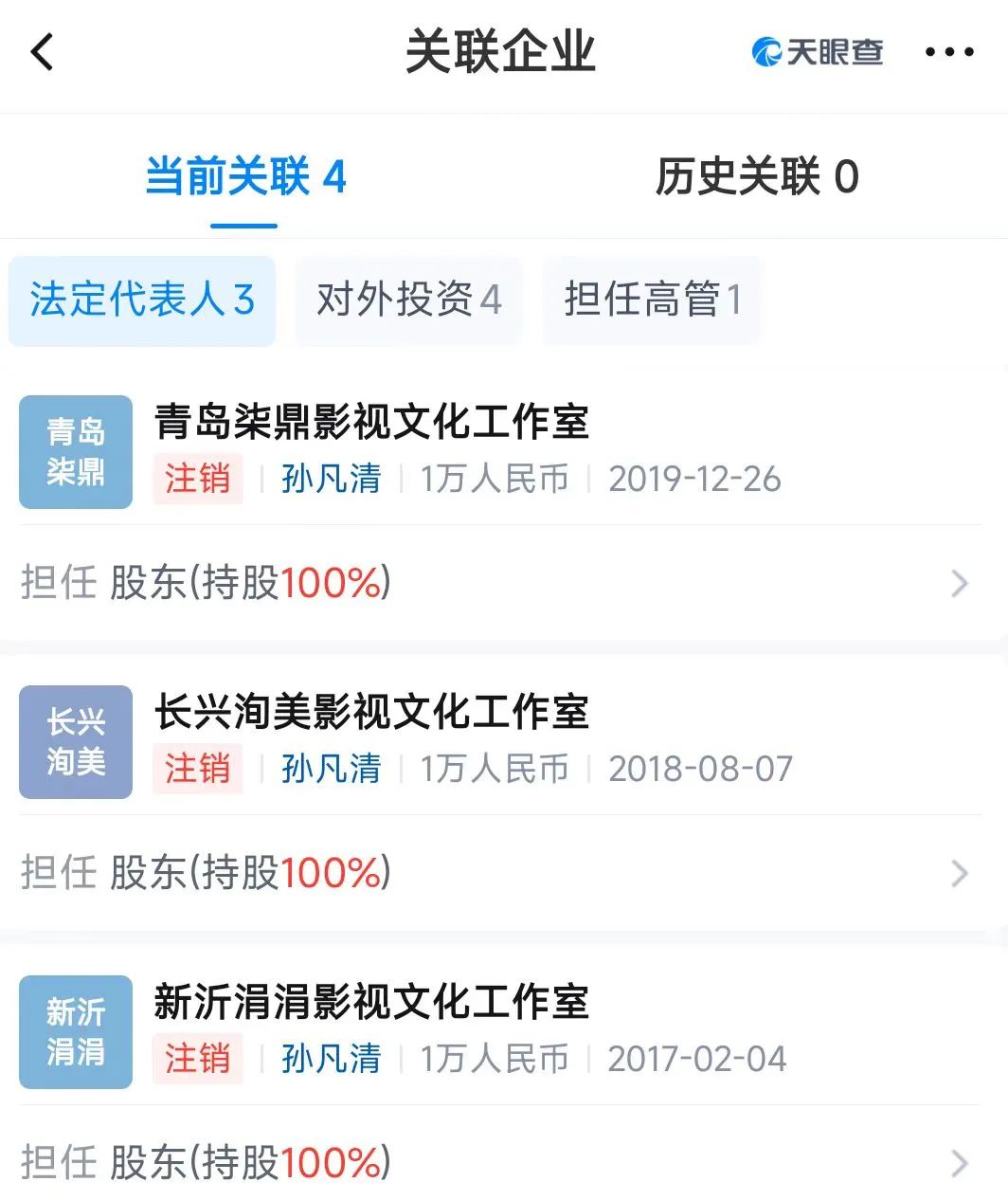 天眼查app显示,宋祖儿(孙凡清)共关联3家企业,其中,由其个人独资的青岛柒鼎影视文化工作室、长兴洵美影视文化工作室、新沂涓涓影视文化工作室均已注销。