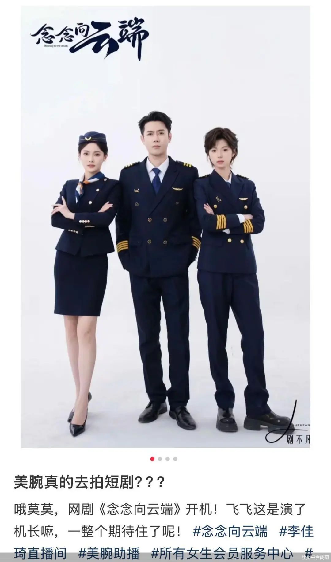 据北京商报报道,4月17日,多位李佳琦的助播参演了一部名为《念念向云端》的短剧。从粉丝们发布的照片来看,助播团中的思雨、Shea、飞飞等有参与该剧并扮演配角,短剧热门演员申浩男和岳雨婷饰演男女主。