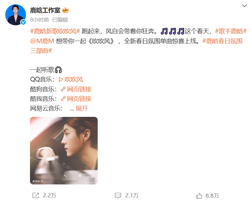 4月27日零点,@鹿晗工作室 官宣鹿晗新歌《吹吹风》,全新春日氛围单曲惊喜上线。
