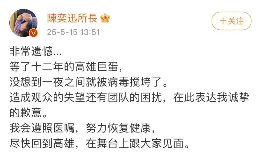 5月15日,陈奕迅 FEAR and DREAMS 巡回演唱会官方微博曾发布延期公告,称歌手陈奕迅(Eason)昨晚突感身体不适,须立即停止所有演出活动并进行休养。面对突如其来的病毒侵袭,确定首周无法如期重返高雄,Eason非常难过也深感歉意。演唱会团队已紧急协调后续安排,原订5月16、17、18日于高雄巨蛋举行的三场演出将延期举行。