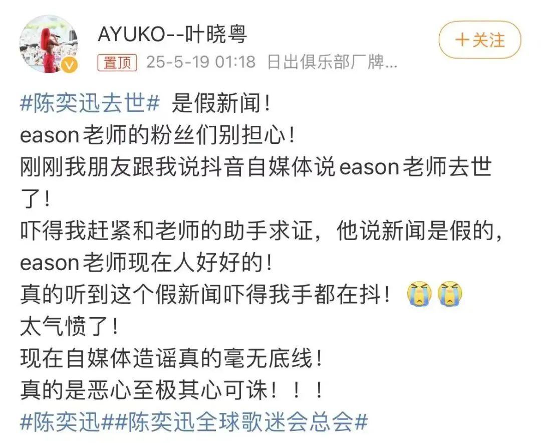 5月19日凌晨1时许,歌手叶晓粤在社交平台发文称,陈奕迅去世是假新闻。叶晓粤表示已和陈奕迅的助手求证,“去世新闻”是假的,他现在人好好的。