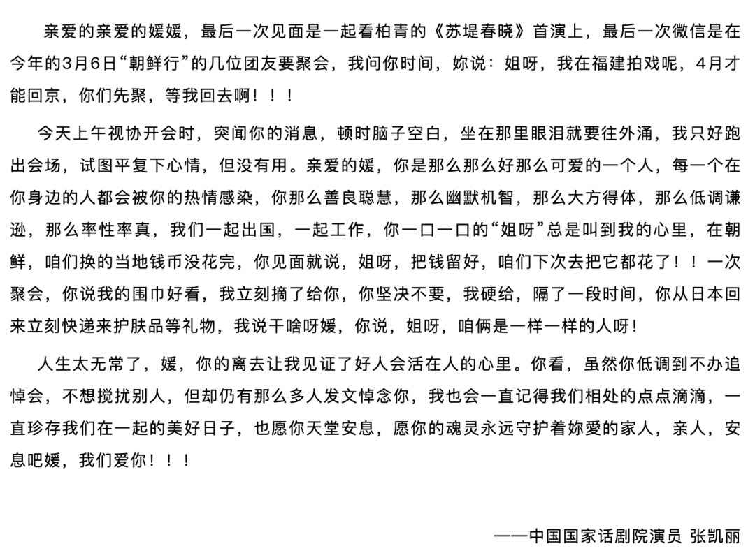 所以,朱媛媛的离去才会令我们如此痛心如此不舍,正如演员张凯丽写的那样:“虽然你低调到不办追悼会,不想搅扰别人,但却仍有那么多人发文悼念你,我也会一直记得我们相处的点点滴滴。”