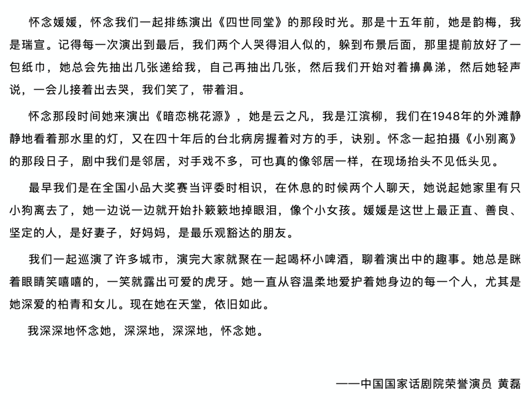 在演员黄磊的悼词中,我们还见到了感性的她。“最早我们是在全国小品大奖赛当评委时相识,在休息的时候两个人聊天,她说起她家里有只小狗离去了,她一边说一边就开始扑簌簌地掉眼泪,像个小女孩。媛媛是这世上最正直、善良、坚定的人,是好妻子,好妈妈,是最乐观豁达的朋友。”