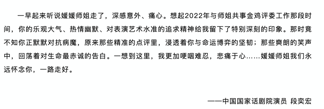 演员段奕宏则回忆了2022年与朱媛媛共事金鸡评委工作的时间,“你的乐观大气、热情幽默、对表演艺术水准的追求精神给我留下了特别深刻的印象。那时竟不知你正默默对抗病魔,原来那些精准的点评里,浸透着你与命运博弈的坚韧”。