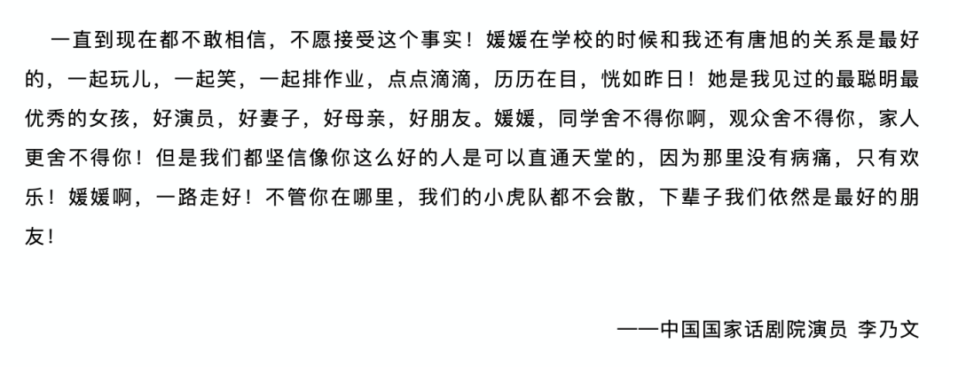 生前好友李乃文在悼词中写到:“她是我见过的最聪明最优秀的女孩,好演员,好妻子,好母亲,好朋友。媛媛,同学舍不得你啊,观众舍不得你,家人更舍不得你!”