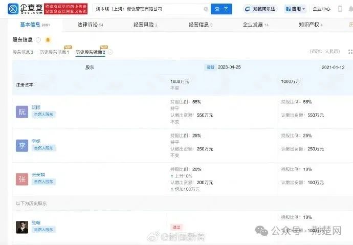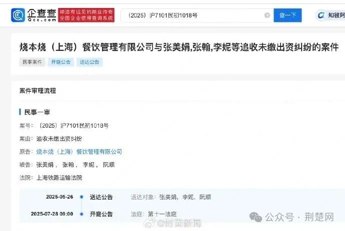 企查查APP显示,5月26日,法院送达烧本烧(上海)餐饮管理有限公司与张翰等追收未缴出资纠纷一案开庭传票等,将于7月28日在上海铁路运输法院开庭审理。信息显示,该公司成立于2021年1月,注册资本1000万,张翰曾持股10%,并于2023年4月退出。