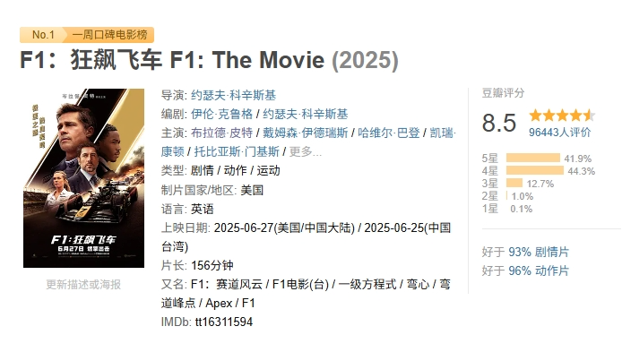 这边厢《碟中谍8:最终清算》还在上映中,并且刚跻身今年进口片的票房冠军,由布拉德·皮特担任制作人和主演的《F1:狂飙飞车》(以下简称《F1》),便拿过了接力棒,点燃暑期档。