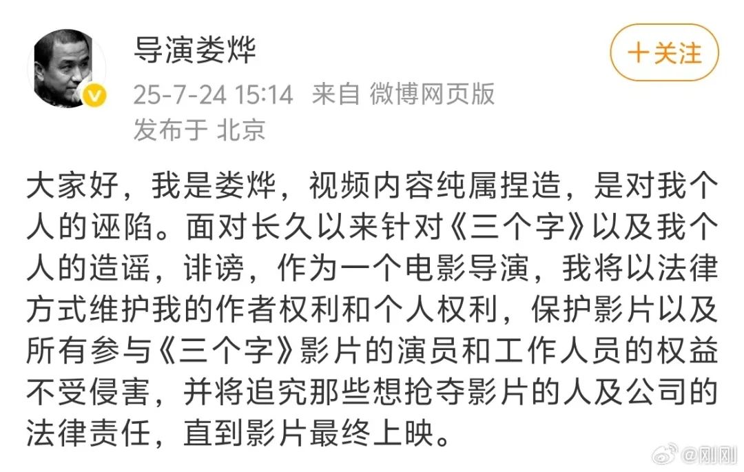 7月24日,娄烨社交平台发文称:视频内容纯属捏造,是对我个人的诬陷。面对长久以来针对《三个字》以及我个人的造谣,诽谤,作为一个电影导演,我将以法律方式维护我的作者权利和个人权利,保护影片以及所有参与《三个字》影片的演员和工作人员的权益不受侵害,并将追究那些想抢夺影片的人及公司的法律责任,直到影片最终上映。