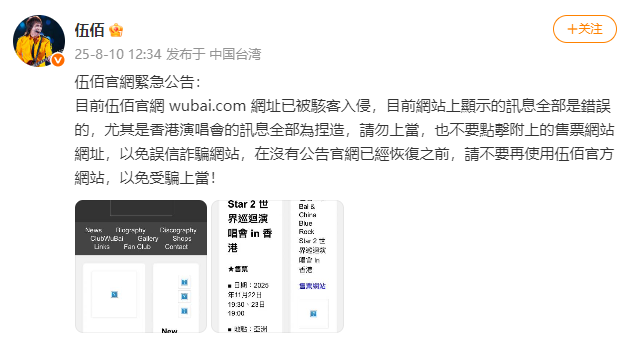 “目前伍佰官网(wubai.com)网址已被骇客入侵,目前网站上显示的讯息全部是错误的,尤其是香港演唱会的讯息全部为捏造,请勿上当,也不要点击附上的售票网站网址,以免误信诈骗网站,在没有公告官网已经恢复之前,请不要再使用伍佰官方网站,以免受骗上当!”