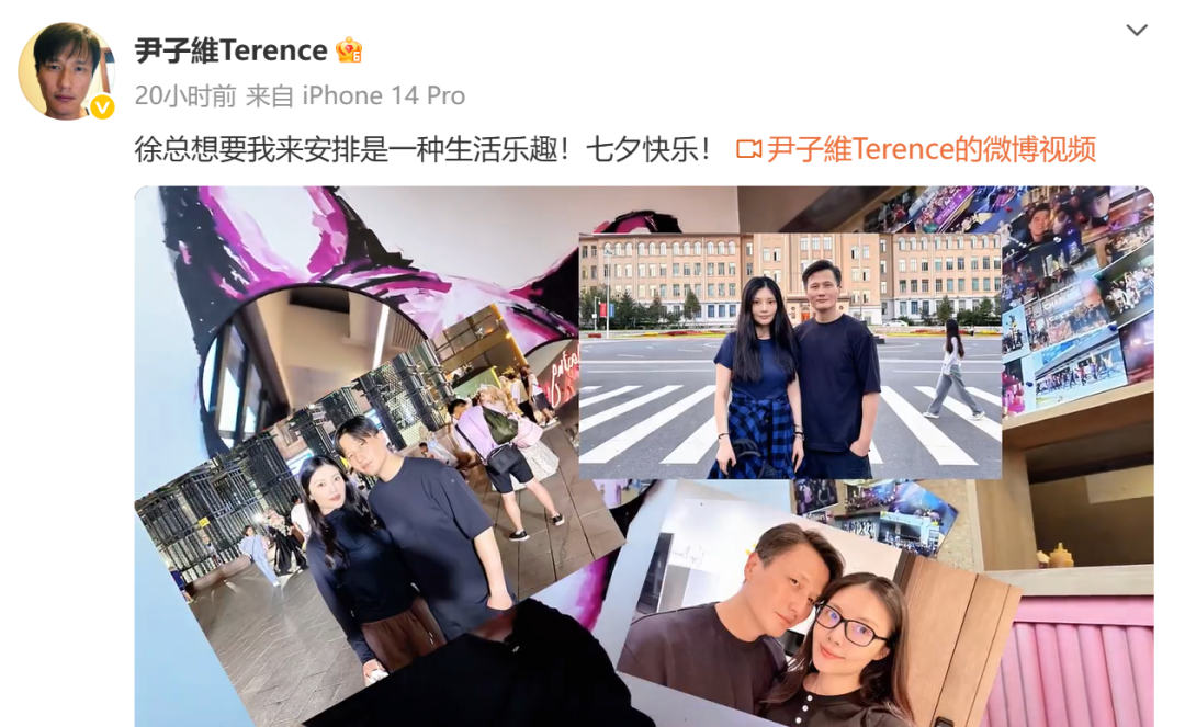 今年七夕节,男星尹子维在社交平台分享七夕动态:徐总想要我来安排是一种生活乐趣!七夕快乐!