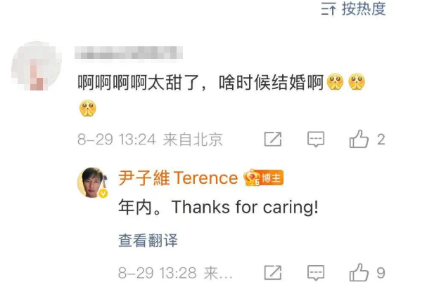 被甜到的网友问,啥时候结婚,尹子维回复:年内。Thanks for caring!