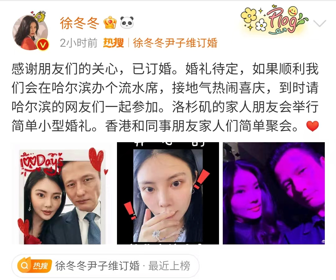 2024年2月,徐冬冬跟尹子维官宣订婚。