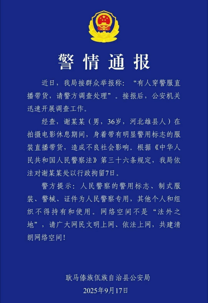 耿马县公安局9月17日晚发布的通报,为这场争议风波画上了一个句号。从9月10日直播到9月17日被拘,短短7天时间里,事件完成了从“争议行为”到“法律惩戒”的定性转变。