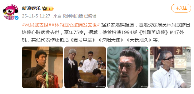 11月5日,据多家港媒报道,香港资深演员林尚武昨日因心脏病发去世,享年75岁。