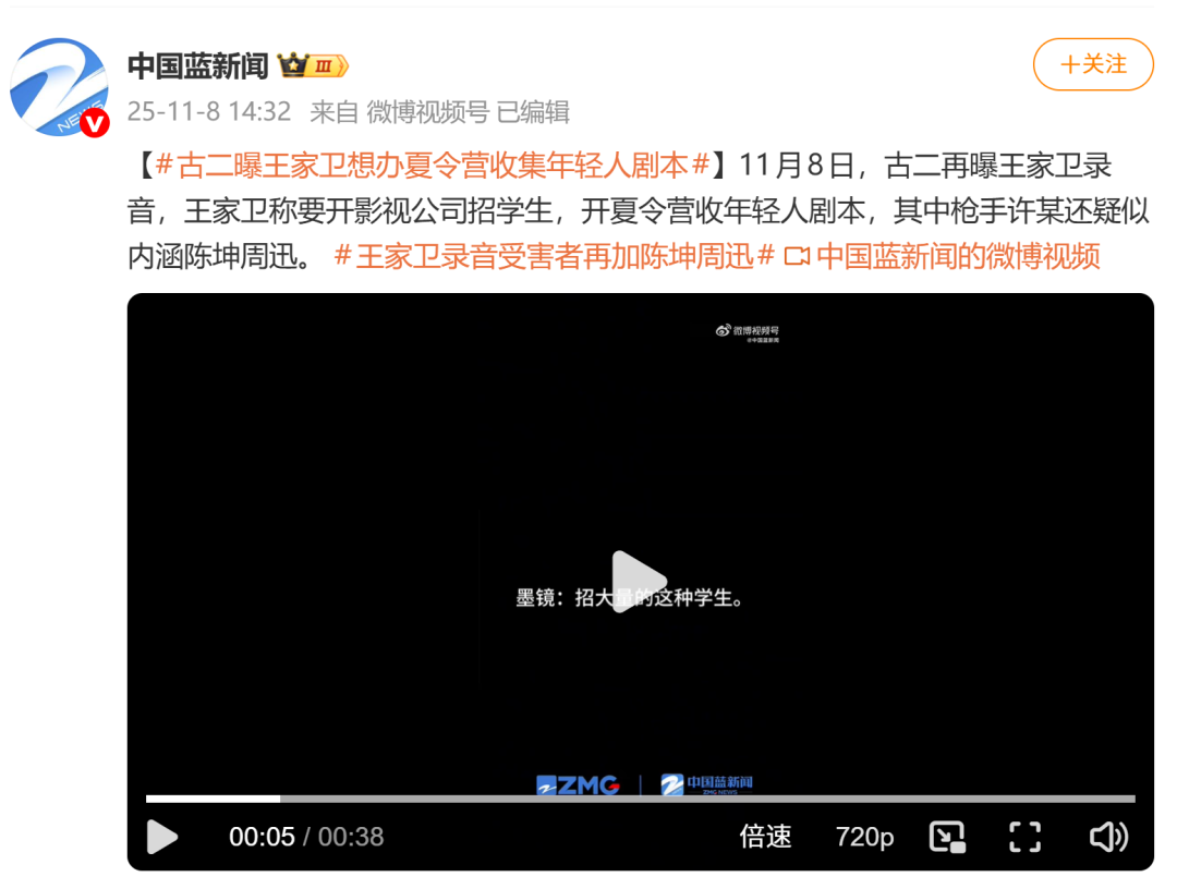 据中国蓝新闻,11月8日古二再曝王家卫录音,王家卫称要开影视公司招学生,开夏令营收年轻人剧本,其中枪手许某还疑似内涵陈坤周迅。