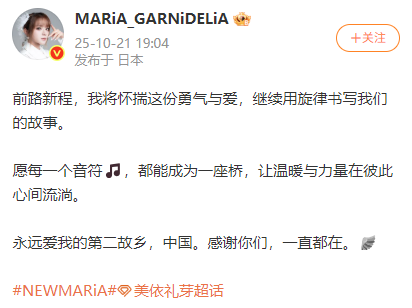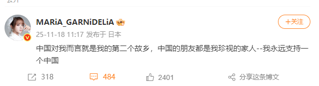 11月18日,日本知名女歌手美依礼芽发文:“中国对我而言就是我的第二个故乡,中国的朋友都是我珍视的家人——我永远支持一个中国。”从其发布的博文来看,IP地址显示在日本。