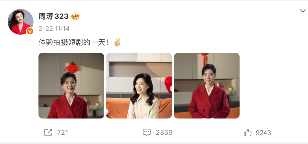 近日,前央视主持人周涛更新社交媒体称:“体验拍摄短剧的一天!”她在视频中表示,第一次拍短剧很好玩,创作过程中自己的状态很轻松。