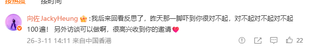 向佐也在评论区道歉:我后来回看反思了,昨天那一脚吓到你很对不起,对不起对不起对不起100遍! 另外访谈可以做啊,很高兴收到你的邀请。
