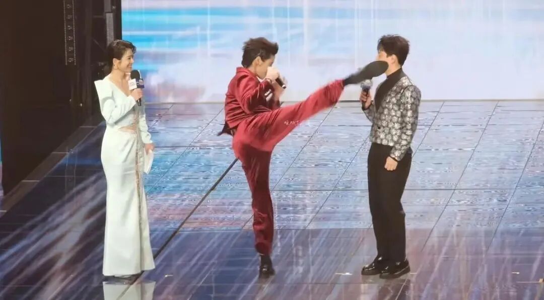 3月10日,向佐在微短剧品质盛典的舞台上展示功夫,主持人夸赞他穿着丝绒西装还把拳打得这么好,向佐突然对着主持人一脚飞踢过去。