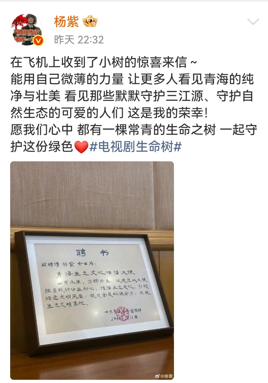 同日晚,演员杨紫发微博称,已获聘“青海生态文化传播大使”,并表示:“能用自己微薄的力量,让更多人看见青海的纯净与壮美,看见那些默默守护三江源、守护自然生态的可爱的人们,这是我的荣幸!”