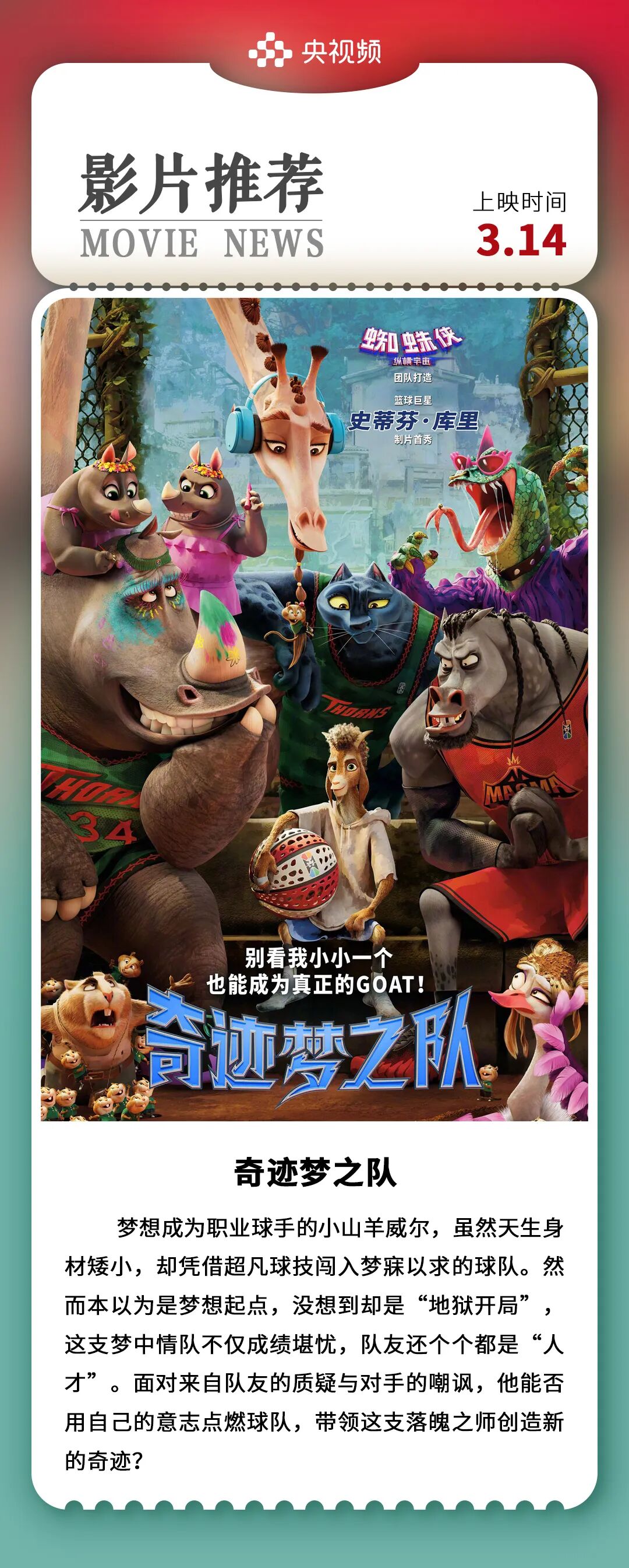 该片由NBA球星库里首次担任制片人,本年度上映后以2600万美元首映周末票房收获北美周末票房亚军,上映第二周便逆袭夺冠,影片由制作《蜘蛛侠:纵横宇宙》的索尼动画团队打造。一只热爱打篮球的小山羊,面对猛兽成群的凶猛赛场,它能否挑战规则?书写传奇?让我们去影院一探究竟吧!