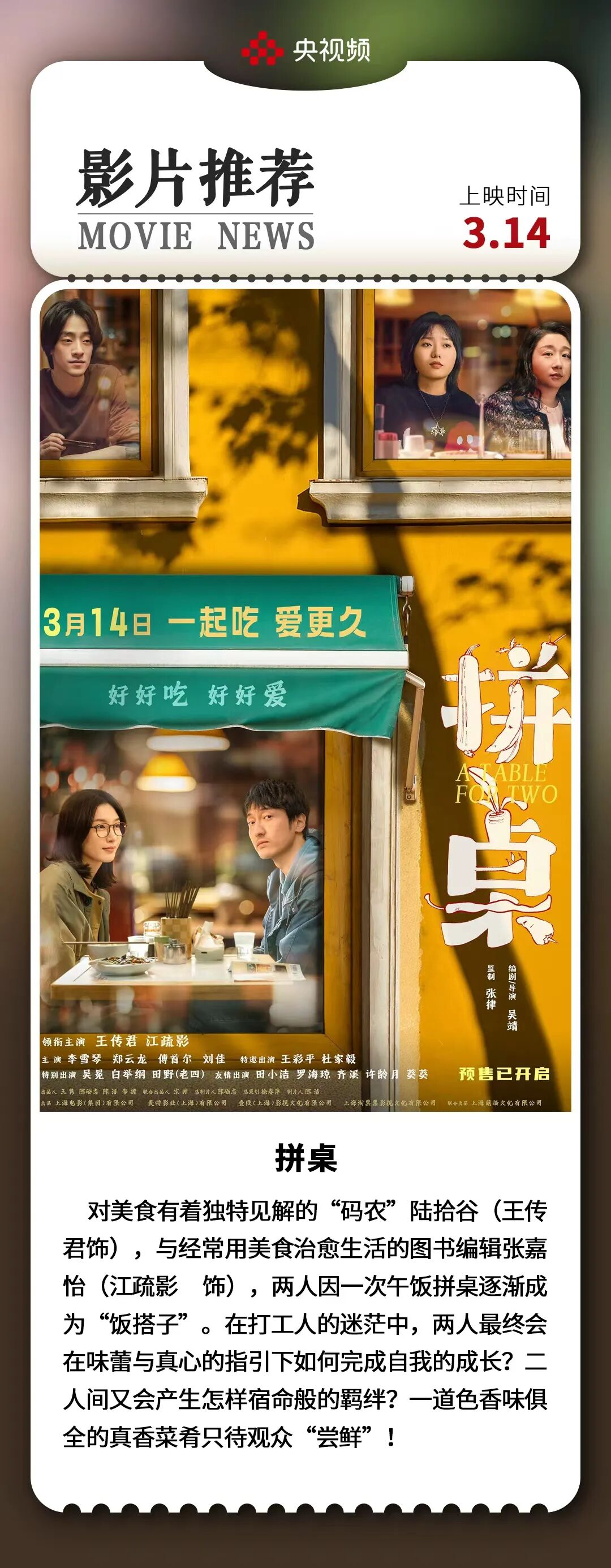 王传君与江疏影首次合作 ,李雪琴友情出演,饰演江疏影的好友三三,在感情线中起到了助攻作用 。影片通过轻喜剧风格展现年轻人对社交关系的新理解,融合爱情元素探讨“学会吃、学会爱”的主题。
