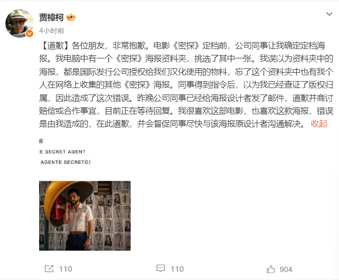近日,电影《密探》中国官方海报被曝是盗用巴西海报设计师的个人作品,引发争议。3月18日,贾樟柯在社交平台发文道歉: