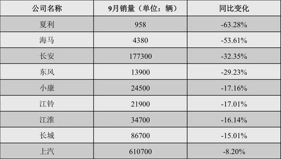 第二,是中低端车销量下跌最为明显。根据馨金融手边的数据显示,9月主要车企都出现了销量下降的趋势,最高降幅超过60%,而一直以来的销量巨头上汽集团也出现了下滑趋势,且同比降幅达超过8%。